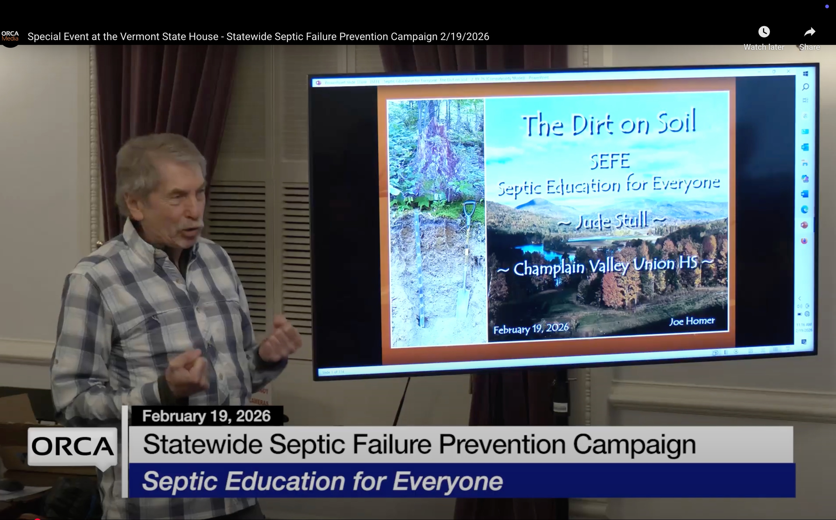 Students from Ms. Heather Morley’s AP Science class at Lake Champlain Valley Union High School traveled to Montpelier to learn about soil science and septic failure prevention. Former NH State Soil Scientist Joe Homer delivered an engaging presentation connecting soil science to real-world septic performance. “It was a really cool presentation — I especially loved the flushing, driveable toilets,” one student shared.